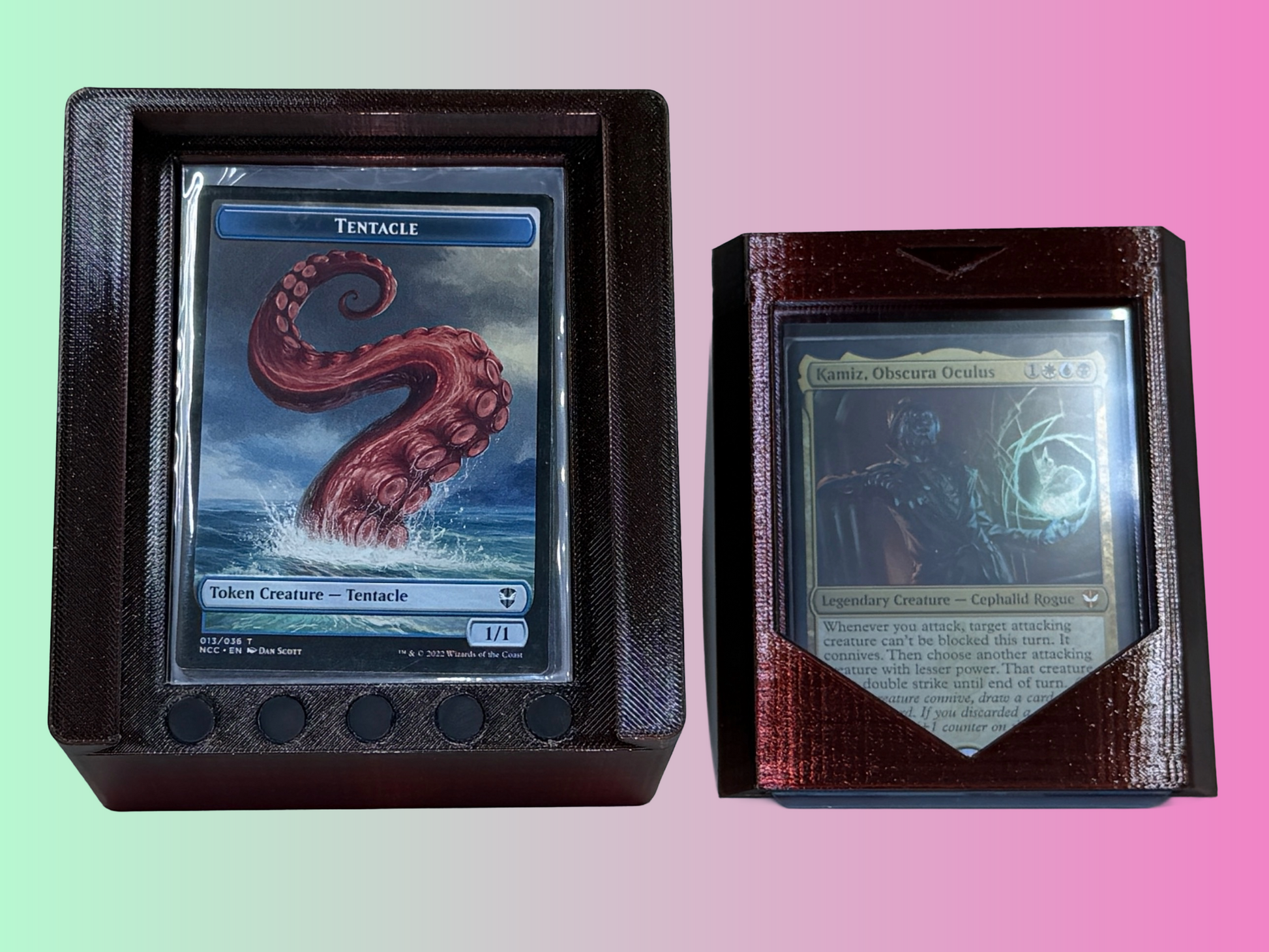 Meet the perfect deck box for showing off your favorite card! Easily identify which deck you you're grabbing out of your bag without needing to open it up, simply look at the top and your showcase card will be easily visible. It holds a double sleeved 60-card deck (even with the thicker resealable inner sleeves) plus some tokens. These are extremely durable, and I am using strong magnets (be careful not to pinch your fingers between the lid), so this box should last you a long time.